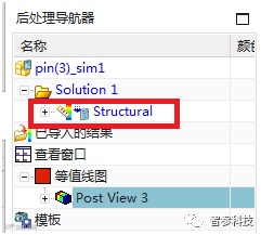 (2)单击后处理导航器中结果文件夹下的structural,从后处理导航器中加载已经求解解算方案的结果。