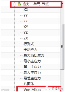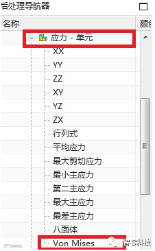(4)选择后处理导航器中solution1文件夹下的structural,再点击structural,选择structural下的应力-单元,双击应力-单元下的Von-Mises。