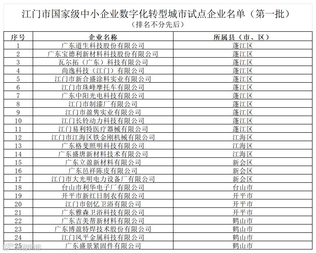 导读:江门市工业和信息化局关于江门市国家级中小企业数字化转型城市试点企业名单(第一批)的公示