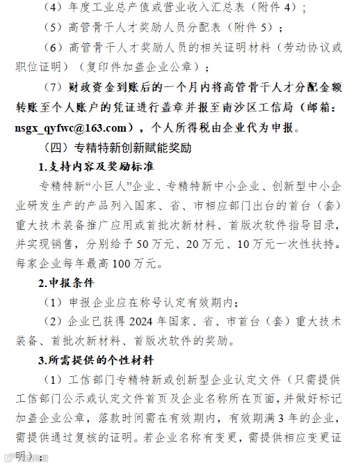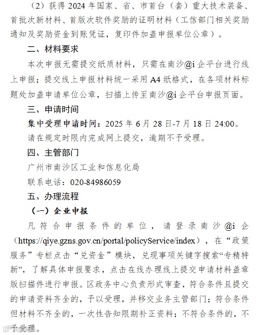 根据《广州南沙新区(自贸片区)促进专精特新中小企业高质量发展若干措施》规定,我局现开展2025年广州南沙新区(自贸片区)促进专精特新中小企业高质量发展项目申报工作,请符合申报条件的单位按照申报指南要求申报。现就有关事项通知如下: