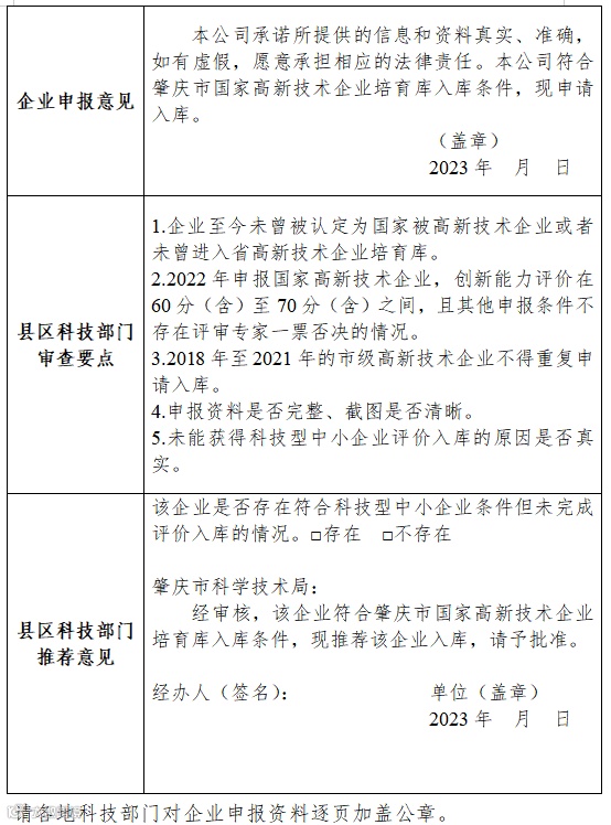 (一)请申报企业填写《2022年肇庆市国家高新技术企业培育库入库申请表》(附件1),正反打印一式一份,加盖公章,报所在地科技部门审核。