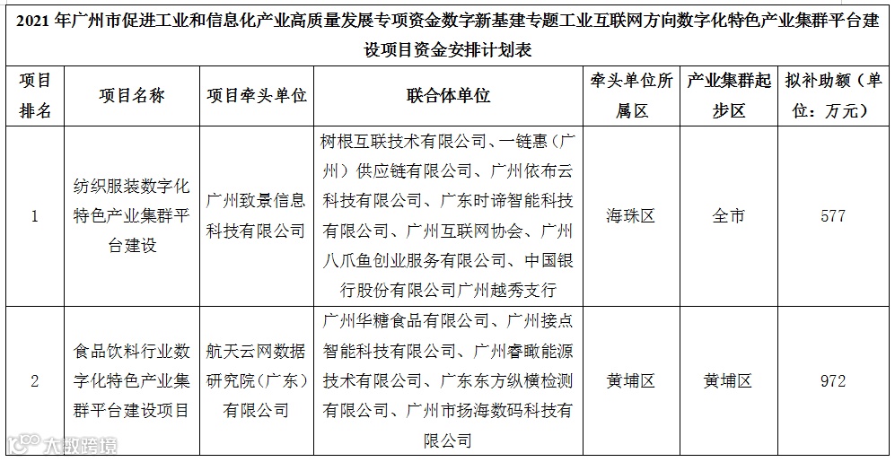 关于2021年广州市促进工业和信息化产业高质量发展专项资金数字新基建专题工业互联网方向数字化特色产业集群平台建设项目资金安排计划的公示