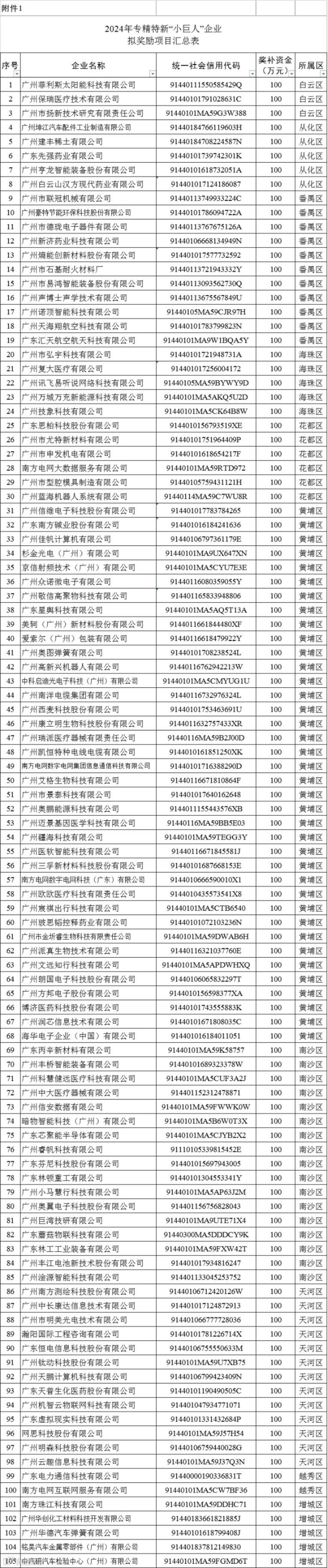 根据《广州市人民政府办公厅关于印发广州市“专精特新”中小企业培育三年行动方案(2022—2024)的通知》(穗府办规〔2022〕4号),经有关程序,广州菲利斯太阳能科技有限公司等105家单位达到领取2024年新认定专精特新“小巨人”企业奖励资金的要求。按照《广州市工业和信息化局惠企政策“免申即享”实施方案(修订)》要求,我局将采用“免申即享”方式兑现奖励资金。
