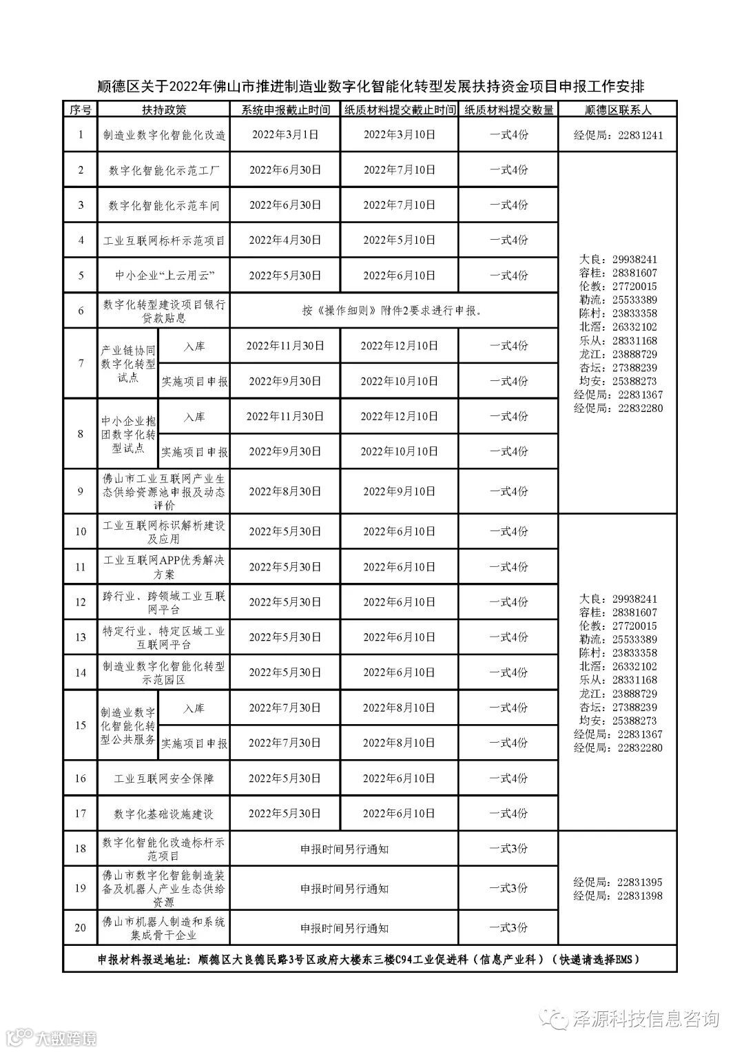 请有意申报的企业根据通知要求编制申报材料,通过佛山扶持通平台(https://fsfczj.foshan.gov.cn)提交电子版申报材料,初审通过后通过平台打印纸质申报材料,提交至顺德区经促局工业促进科,逾期不再受理。注意事项:1.申报截止时间、有关项目的联系方式请查阅《顺德区关于2022年佛山市推进制造业数字化智能化转型发展扶持资金项目申报工作安排》。2.申报材料报送地址:顺德区大良德民路3号区政府大楼东三楼C94工业促进科(信息产业科)。