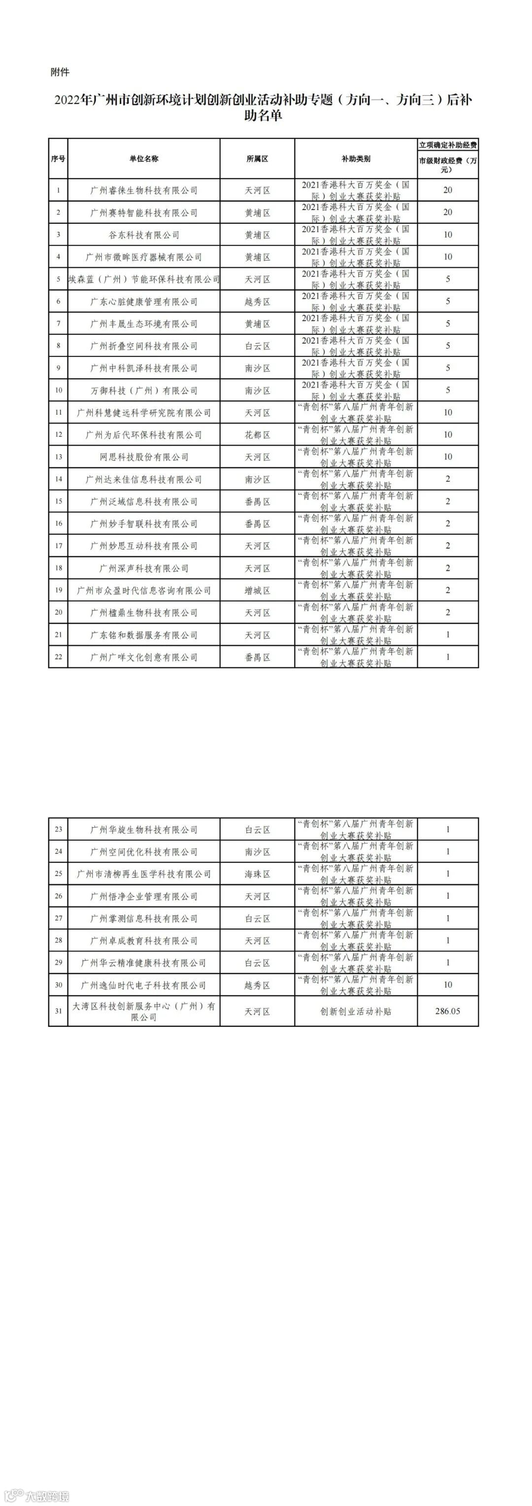 根据《广州市科技计划项目管理办法》(穗科规字〔2019〕3号)有关规定,现公开2022年广州市创新环境计划创新创业活动补助专题(方向一、方向三)后补助名单。