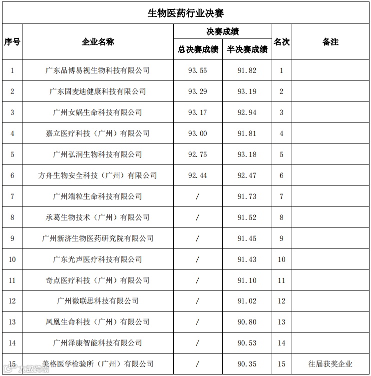 2021年第十届中国创新创业大赛(广东·广州赛区)暨第六届羊城“科创杯”创新创业大赛决赛成绩