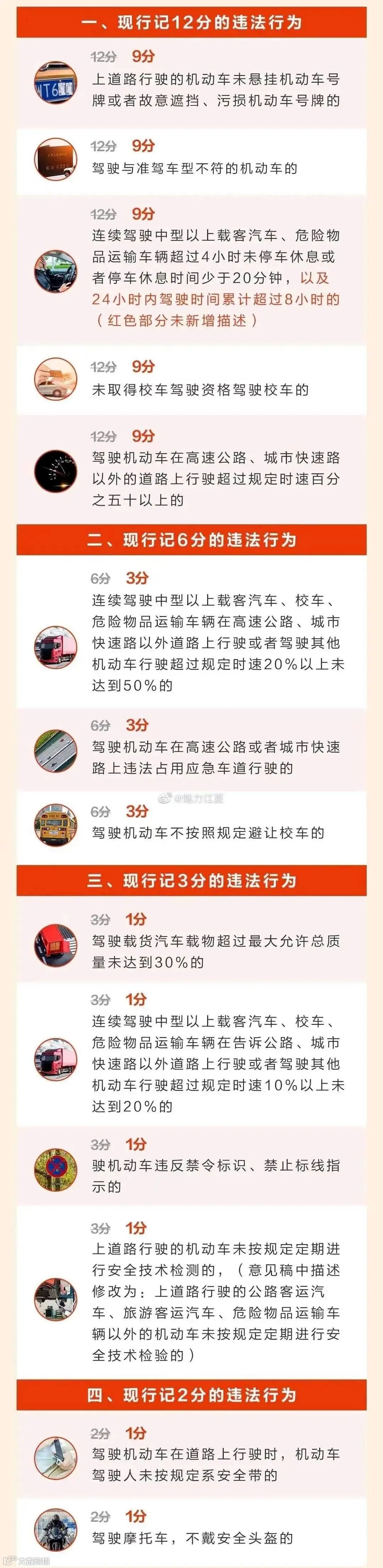 ● 新:驾驶校车、中型以上载客载货汽车、危险物品运输车辆在高速公路、城市快速路上行驶超过规定时速百分之二十以上,或者驾驶其他机动车在高速公路、城市快速路上行驶超过规定时速百分之五十以上的(12分)