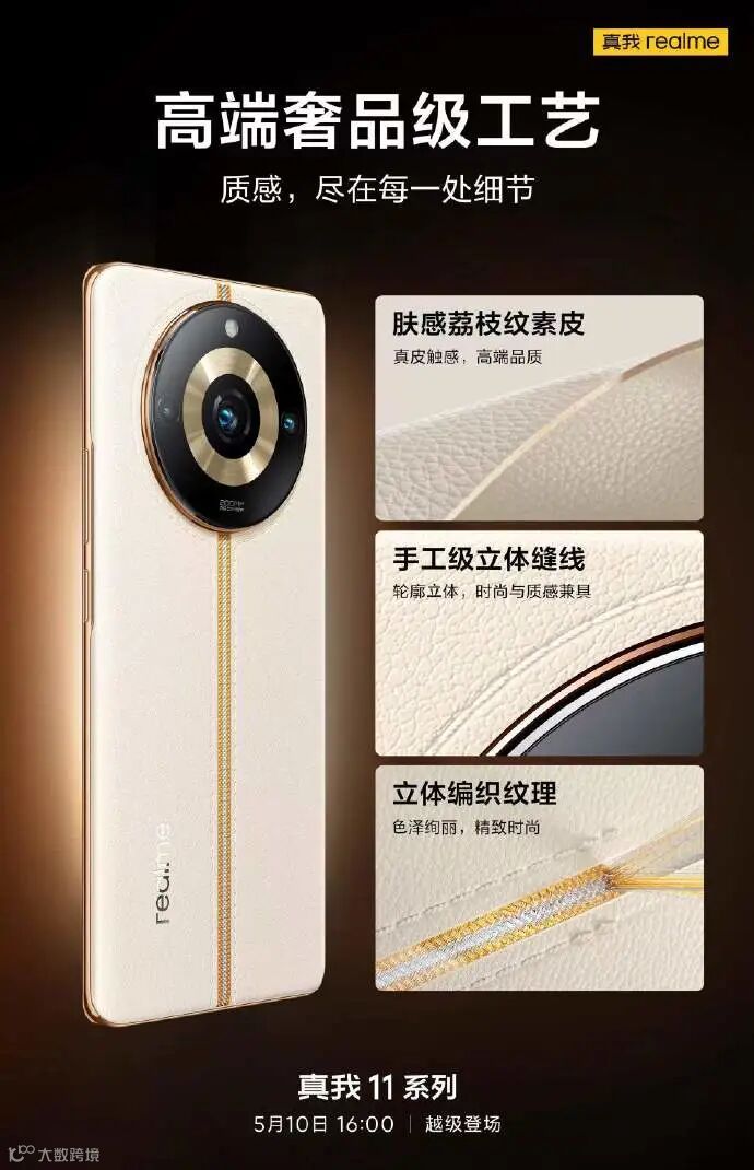 另据官方此前的预热,真我 11 系列的主打配色为“日出之城”,是携手前GUCCI 印花设计师 Matteo Menotto 联名设计,并选用了肤感荔枝纹素皮、手工级立体缝线以及立体编织纹理,增加了手机的质感。