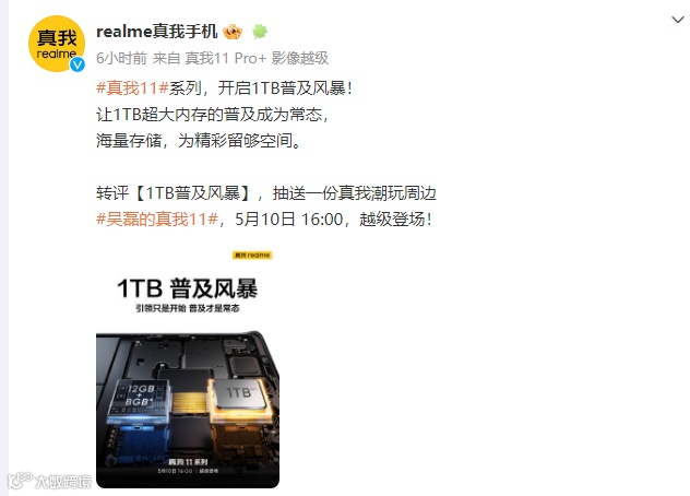 据@realme真我手机 官方的预热,真我 11 系列将开启1TB普及风暴,让1TB超大内存的普及成为常态。