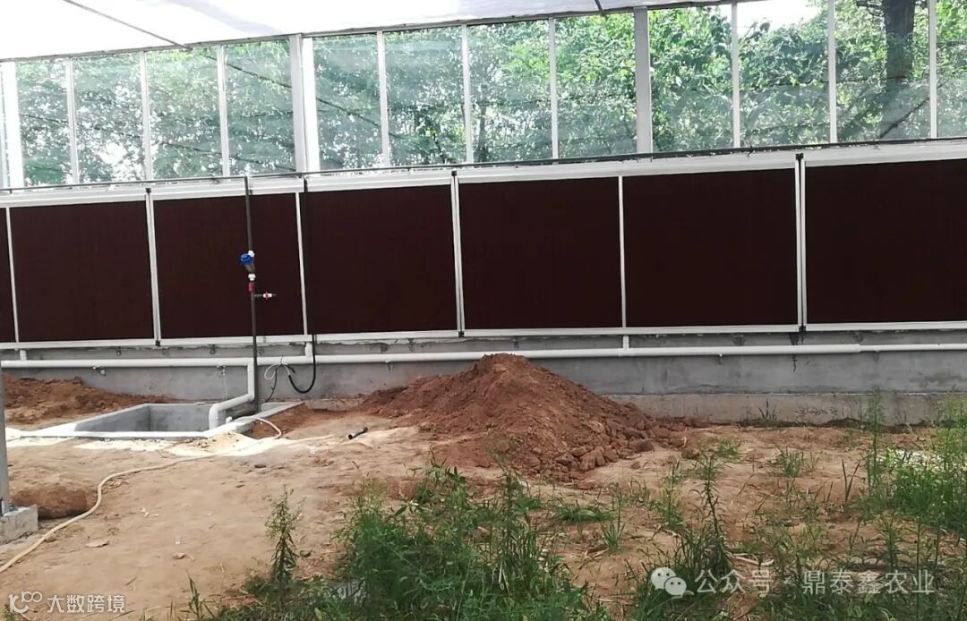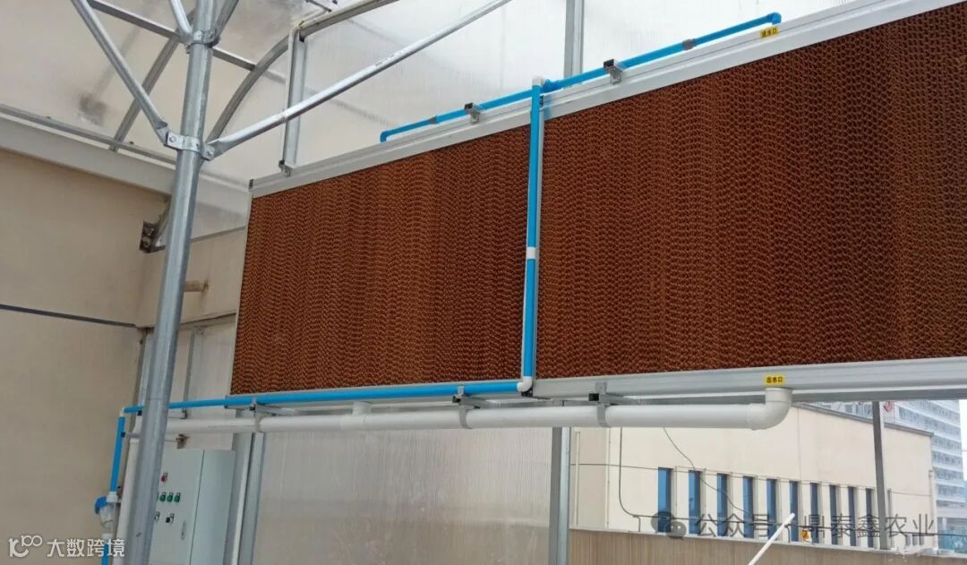 风机+湿帘降温系统在夏季持续高温的状况,具有极佳的降温效果。一般情况下,湿帘和风机分别按照在相对的两侧山墙上,它主要是利用水蒸气使空气中的湿气转化为潜热来实现降温的目的。在实施降温时,系统首先启动风机将室内闷热的空气抽出,在温室内形成微负压,这时,室外空气会由于负压作用被吸入室内,湿帘则被供水系统均匀淋湿,室外空气进入时经过湿帘,从而降低自身温度,达到温室降温目的。