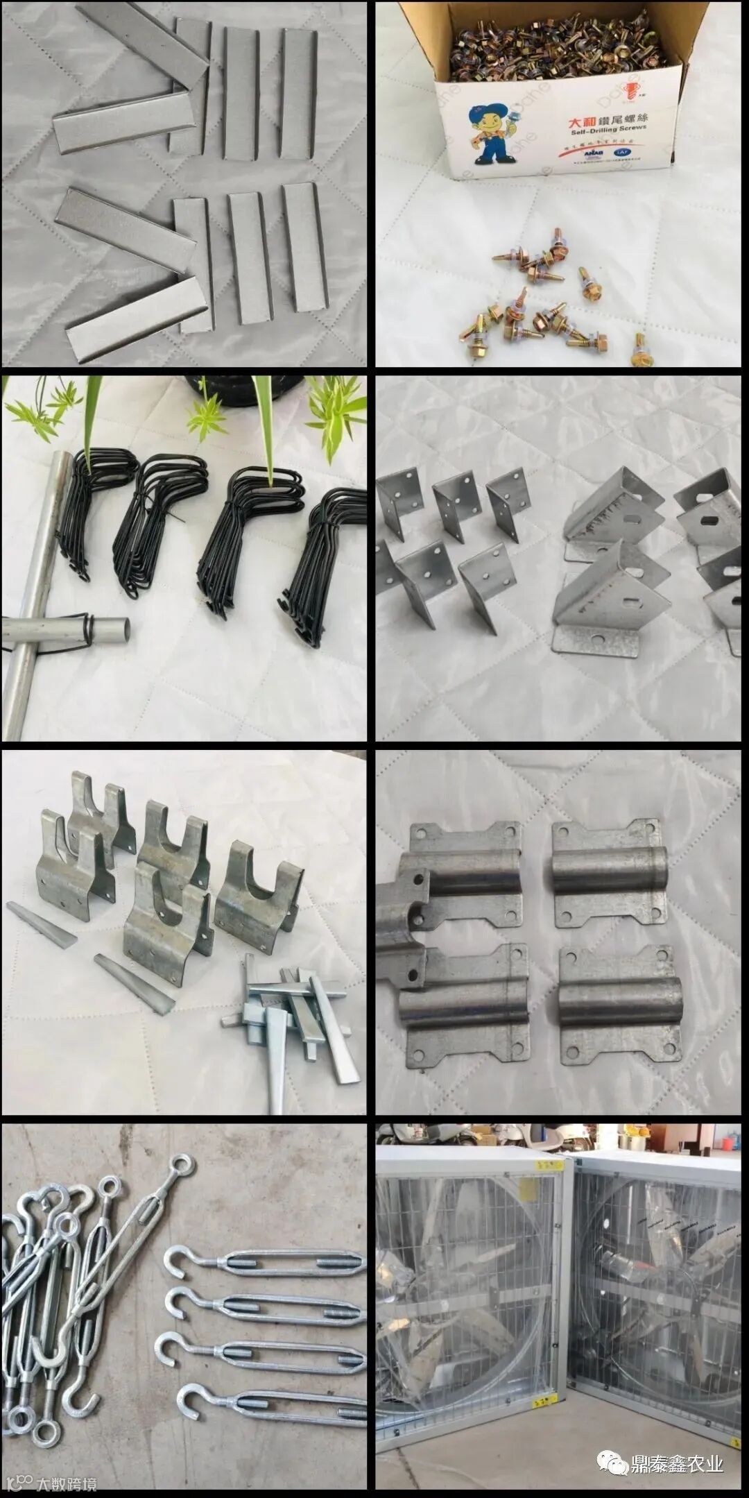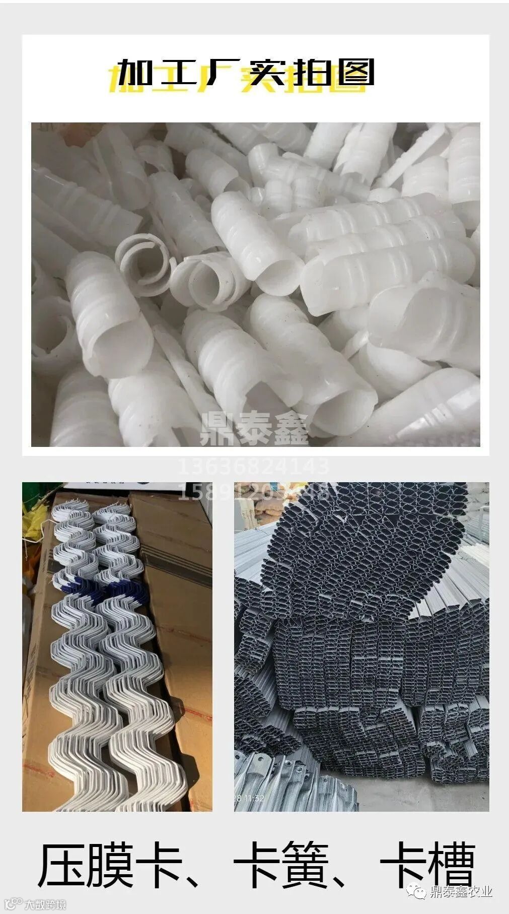 卡簧卡槽、卡槽连接片、卡槽固定器、防虫网、压膜卡、压膜带、压顶簧、夹箍、双拱卡、U型卡、门座、门包角、护套、T型卡、人字卡、镀锌钢管、钢管直接、钢管弯接、双拱卡、角连接、十字卡、门座、门合页、门包角、地锚、钢丝、铁丝、压膜绳、压膜带、大棚棚膜、棚膜胶带、无纺布、大棚卷帘机、手动卷膜器、电动卷膜器、链条卷膜器、涡轮卷膜器、黑(白)托慕线、开窗遮阳电机、定位卡丝、绑线、引线簧、推杆接头、轨道齿条座、A型座、屋脊连接件、驱动卡,门型轮、风机湿帘,内外遮阳网等配件。