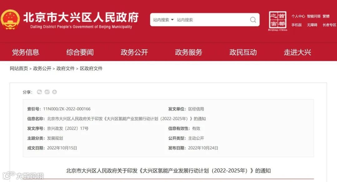 10月24日,北京市大兴区人民政府正式印发《大兴区氢能产业发展行动计划(2022-2025年)》。