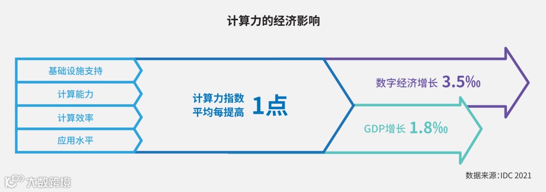 计算力指数平均每提高 1 点,国家的数字经济和 GDP 将分别增长 3.5 ‰和 1.8 ‰。