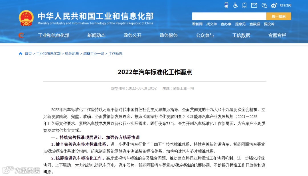 3月18日,工信部印发了《2022年汽车标准化工作要点》。