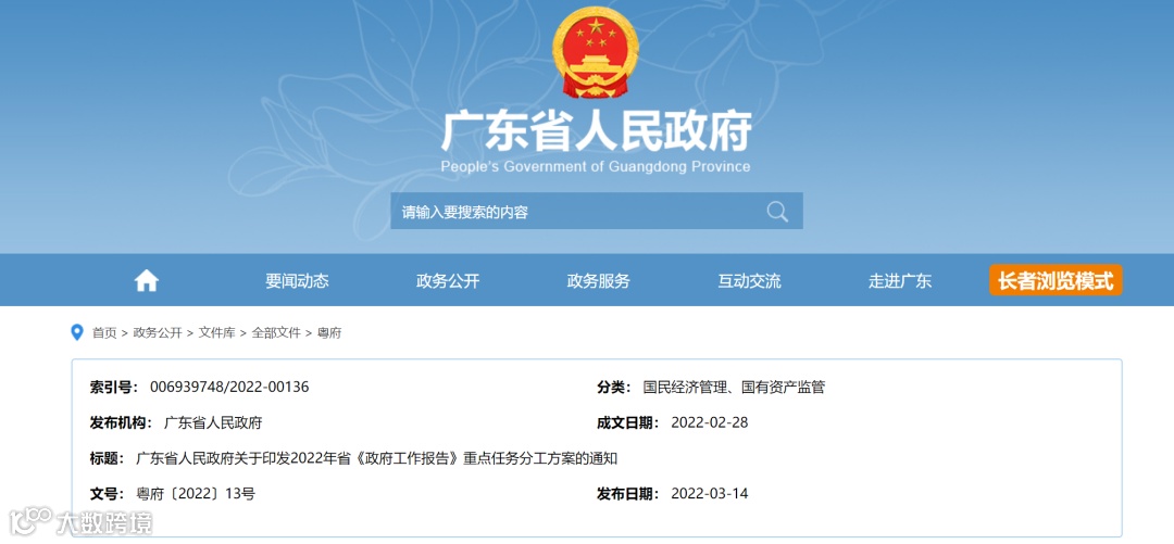 广东省人民政府印发了《关于印发2022年省政府工作报告重点任务分工方案的通知》。