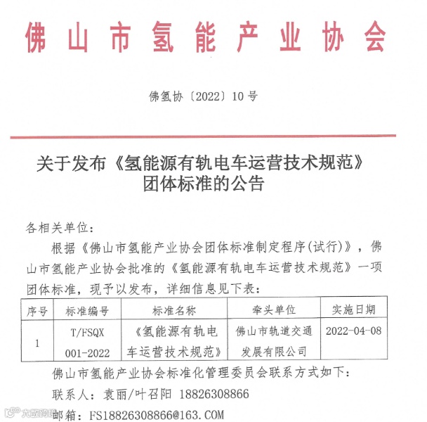 近日,佛山市氢能产业协会发布了《氢能源有轨电车运营技术规范》 团体标准。本标准于2022年4月8日起实施。