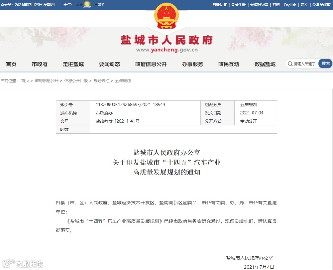 7月4日,盐城市人民政府印发《盐城市“十四五”汽车产业高质量发展规划》。在“十四五”期间,盐城市将重点围绕绿色低碳发展推进汽车产业转型,关注新能源汽车、专用车、传统汽车领域发展。