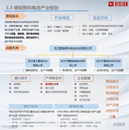 武汉氢雄营销副总江海克在甫圆满落幕的高工峰会上表示,相信在国家政策推动下,中国燃料电池将攻克一系列难点,迈向快速成长期。武汉氢雄母公司雄韬股份(002733)将氢燃料电池作为未来的主攻发展方向,参股氢璞创能、投资115亿建设武汉氢能产业园。目前在氢能产业链已形成制氢、膜电极、燃料电池电堆、燃料电池发动机系统、整车运营等关键环节的卡位布局。