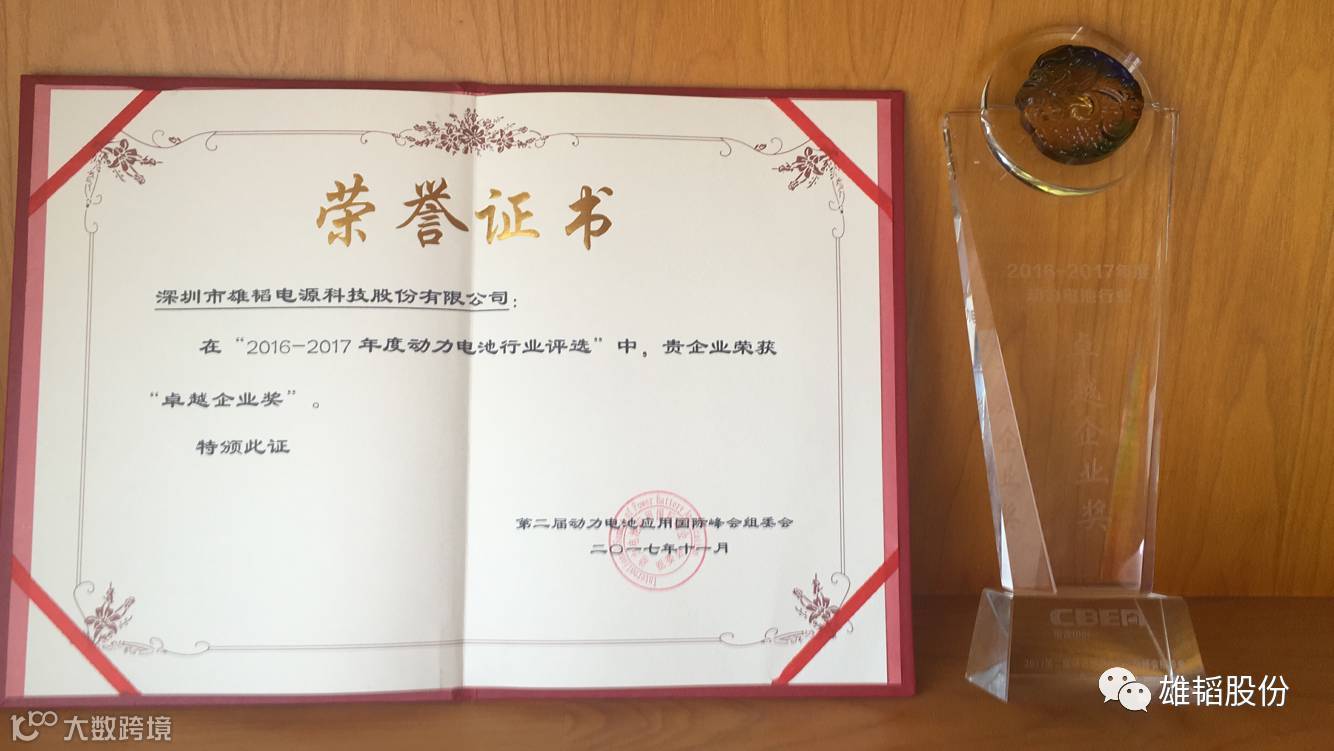 在11月16日“2017’第二届动力电池应用国际峰会暨第三届中国电池行业智能制造研讨会”(下文简称峰会)的欢迎晚宴上,备受瞩目的“2016-2017年度动力电池行业评选”结果揭晓,雄韬近年来在新能源领域的努力有目共睹,也获得了“年度卓越企业奖”的最大肯定。