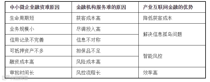 (四)产业互联网金融服务商相比传统金融机构有四方面优势。中小微企业天然具有生命周期短、业务规模小、抵押资产少、信息不对称等问题,过去我国采用城商行及农商行服务当地的做法,效率并不够高,不能完全满足中小微企业融资需求。产业互联网金融相比传统金融机构服务可以有效解决获客成本、信息孤岛、智能风控、审批效率等问题。