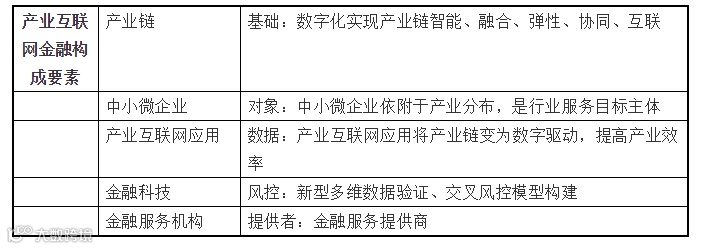 (三)产业互联网金融有五类基本构成要素。产业互联网金融的基本构成要素分别为产业链、中小微企业、产业互联网应用、金融科技及金融服务机构。我认为未来产业互联网金融行业的重要节点在产业互联网应用与金融科技两个部分,这一点类似C端的消费金融。