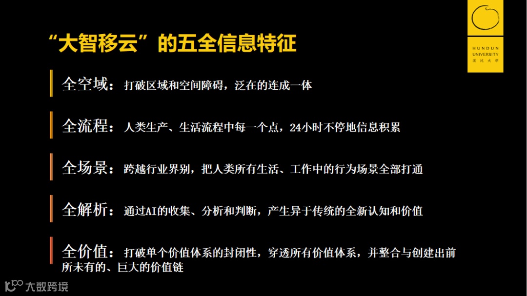 为什么互联网数字化平台会有如此强大的颠覆性?研究表明,“大智移云”基础平台存在“五全信息特征”:全空域、全流程、全场景、全解析和全价值的信息。