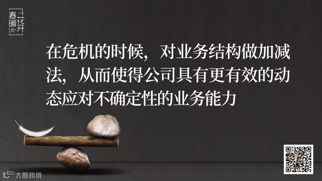 当然在危机中依然需要非常清晰的方向判断、足够强的勇气和抵抗风险的能力,以及理性的决策。我们需要承认的是,如果能在危机中找到一个明确的方向并增加投入,之后所获得的增长将是无法估量的。在危机的时候,对业务结构做加减法,从而使得公司具有更有效的动态应对不确定性的业务能力,一旦机会来临,这种更加合理的业务结构便能让企业有机会与其他企业拉开距离。