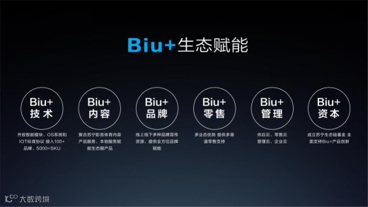 苏宁小Biu的优势在于苏宁本身在3C领域有深耕,与全国各大家电厂商之间有紧密的合作,通过Biu+生态将技术标准接入各大智能家电产品之中,让用户使用不同品牌的产品也能够实现接入。苏宁Biu+生态本质上是为合作品牌提供一个双向开放、灵活接入的全方位一站式平台,并持续探索创新需求、制定交互标准和技术规范,从而打造出Biu OS产品智能化全栈解决方案。