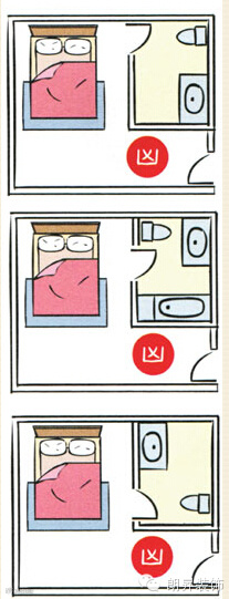 房间里的厕所对到床,情况比房门对到厕所严重,对到头,会头痛、思考时不能集中,住久了会产生肿瘤、中风等;对到腰,会腰酸、心脏无力、水肿,住久了会产生糖尿病、心脏病;对到脚,会坐骨酸痛、膝盖无力、痛风水肿,住久了会产生意外骨折。