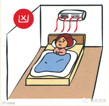 床位安置在空调下方,寒气不断吹向头、肩、颈,加上人在睡眠状态时,毛细孔会略微放开,轻者经常感冒,重者会造成头、肩、颈的神经紧张、肌肉僵化。