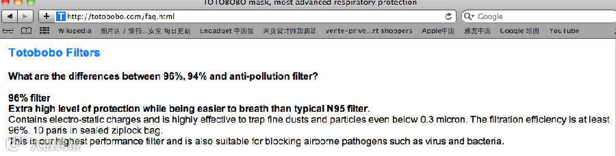 在其官网的FAQ中,亦有明确表述,滤芯符合N95标准,即针对PM0.3能够达到95%以上的过滤率。在新加坡这样一个法制严明的发达国家,我暂时找不到对其怀疑的理由。