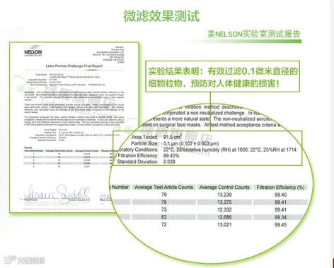 暂不论”绿盾“送去的滤片和其量产口罩中的滤片是否是同一款,”绿盾”只秀出了报告中对其有利的内容,即针对0.1微米的过滤率达到99%以上。我们姑且相信这个信息不是伪造的,因为目前看来这家企业确实不是什么值得信赖的对象。