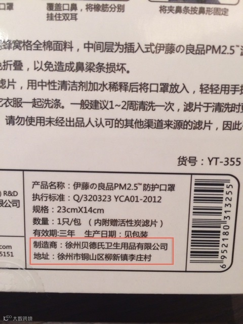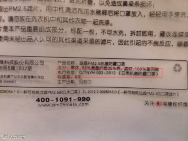 产品包装的正面没有明确的执行标准,但采用了跟“伊藤良品”同样误导消费者的恶劣手段:在"PM2.5"字样右上方加上“TM"标记,这样一来PM2.5就变成了品牌。这样的调调,让我不得不怀疑这款口罩是否跟“伊藤良品”同属一丘之貉。