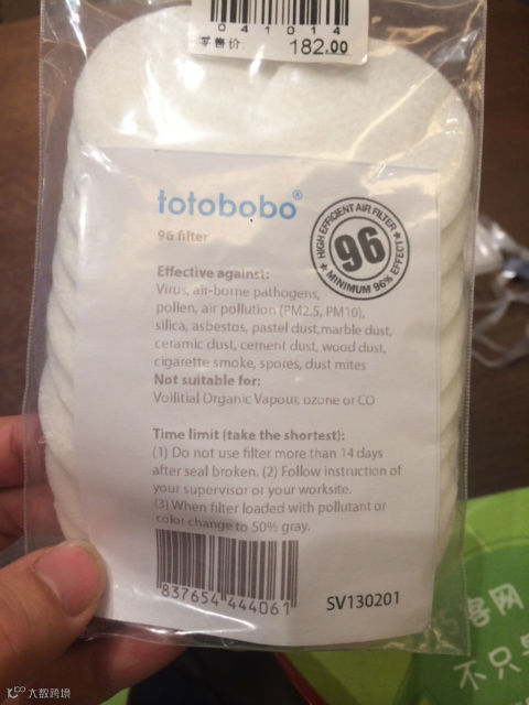 上图中的圆形滤芯已经明显变黑了,这只口罩我在杭州仅佩戴了累积48小时左右,如果你想说服一个人戴口罩,totobobo一定是最好的选择,因为污染很直观的体现在了滤芯颜色的变化上。