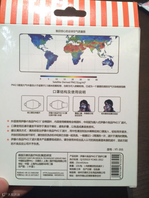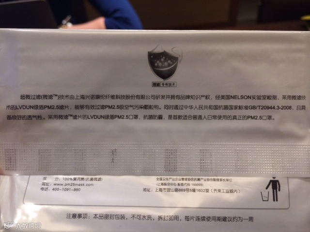 再看包装背面,说明了口罩罩体用的是"PM2.5"全棉面料,注意,这里的"PM2.5"右上方也有TM标志,说明其含义并非PM2.5本身,而是一个名为“PM2.5"牌的注册商标,但它可跟真正的"PM2.5"一点关系都没有!