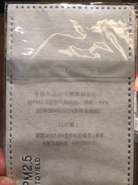 滤片的包装上很NB的写着对PM2.5的过滤率大于等于99%,也就是达到了美标N99,欧标FFP3,以及国标KN100的等级!确实不得了,不过按照这家公司的造性,如果自己的产品真的具备这样的性能能够获得上述三个执行标准中任何一个的认证,肯定会在包装上印满相关的字样吧,而现在不但包装上什么都没有,还要耍小聪明打擦边球误导消费者,又是为什么呢?
