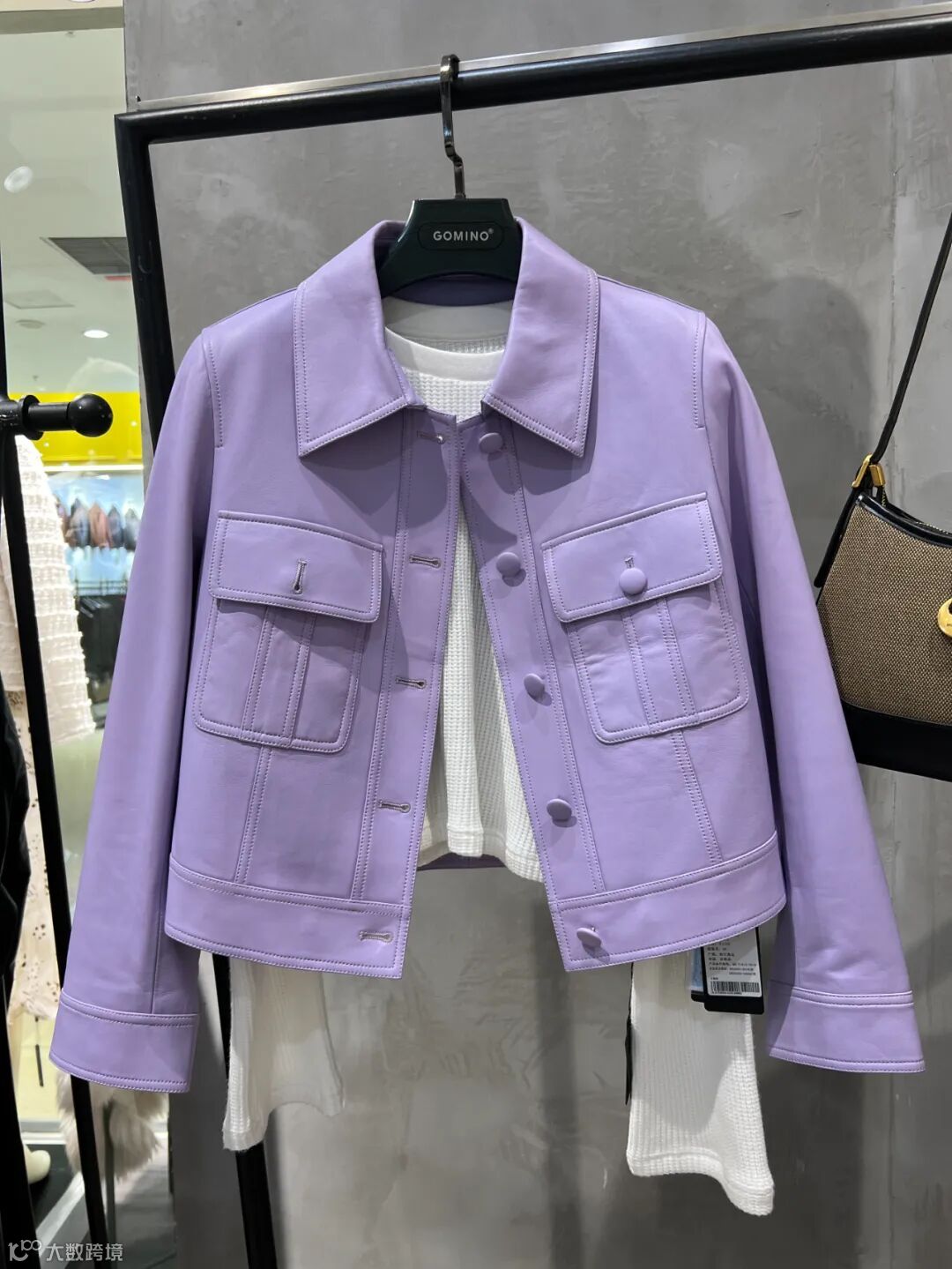 春日浪漫的紫色调短款皮衣,经典的小翻领设计,增添了一丝优雅与复古的味道~