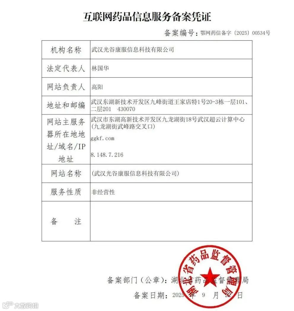 武汉光谷康服信息科技有限公司正式获得由湖北中药市场监督管理局颁发的《互联网药品信息服务备案凭证》(备案编号:鄂网药信备字〔2025〕00534号),这标志着该公司的专业性与合规性获得了官方认可。