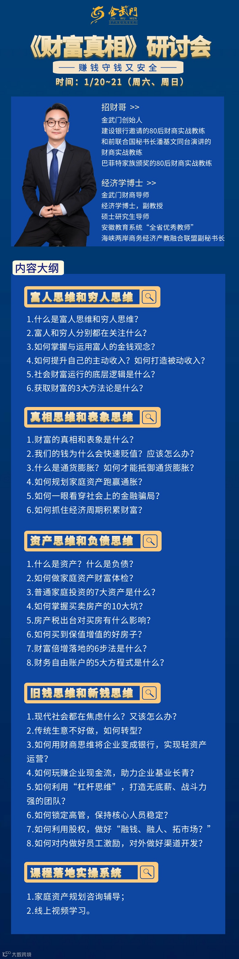 穷人与富人的重要区别:富人最后才买奢侈品,而穷人和中产阶级会先买下诸如大房子、珠宝、皮衣、宝石、游艇等奢侈品,因为他们想让自己看上去很富有。真正的奢侈品是对投资和积累真正资产的奖励。——资产倍增落地引领者+华东区财商教育第一品牌~金武门集团,于1月20-21日合肥隆重召开第12期《财富真相》研讨会,三天两夜,让您少奋斗十年!不学财商•必定财伤!名额有限、报名从速…