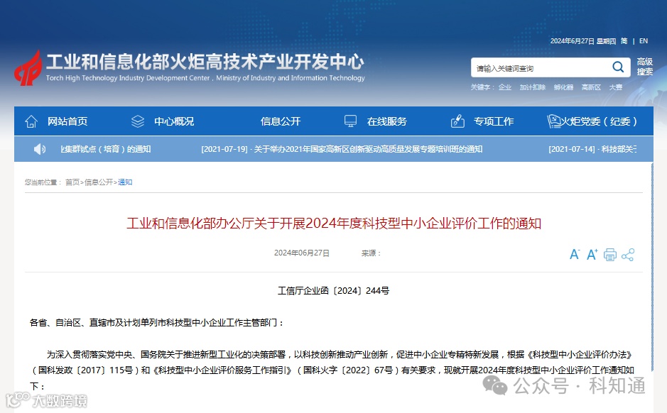 为深入贯彻落实党中央、国务院关于推进新型工业化的决策部署,以科技创新推动产业创新,促进中小企业专精特新发展,根据《科技型中小企业评价办法》(国科发政〔2017〕115号)和《科技型中小企业评价服务工作指引》(国科火字〔2022〕67号)有关要求,现就开展2024年度科技型中小企业评价工作通知如下: