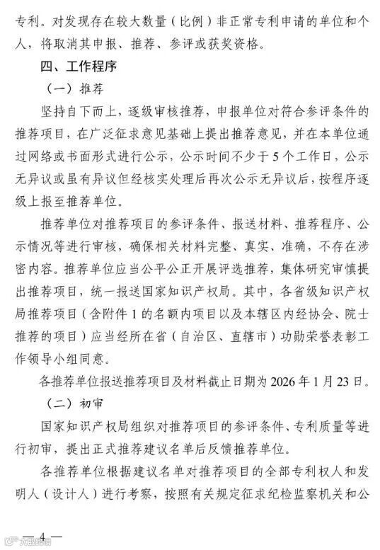2、国家局推荐截止:各推荐单位向国家知识产权局报送材料的最终截止日为2026年1月23日。
