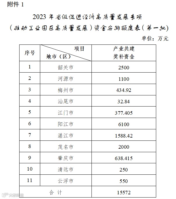 2023年省级促进经济高质量发展专项(推动工业园区高质量发展)资金(第一批)共安排15572万元,均为产业共建奖补资金。
