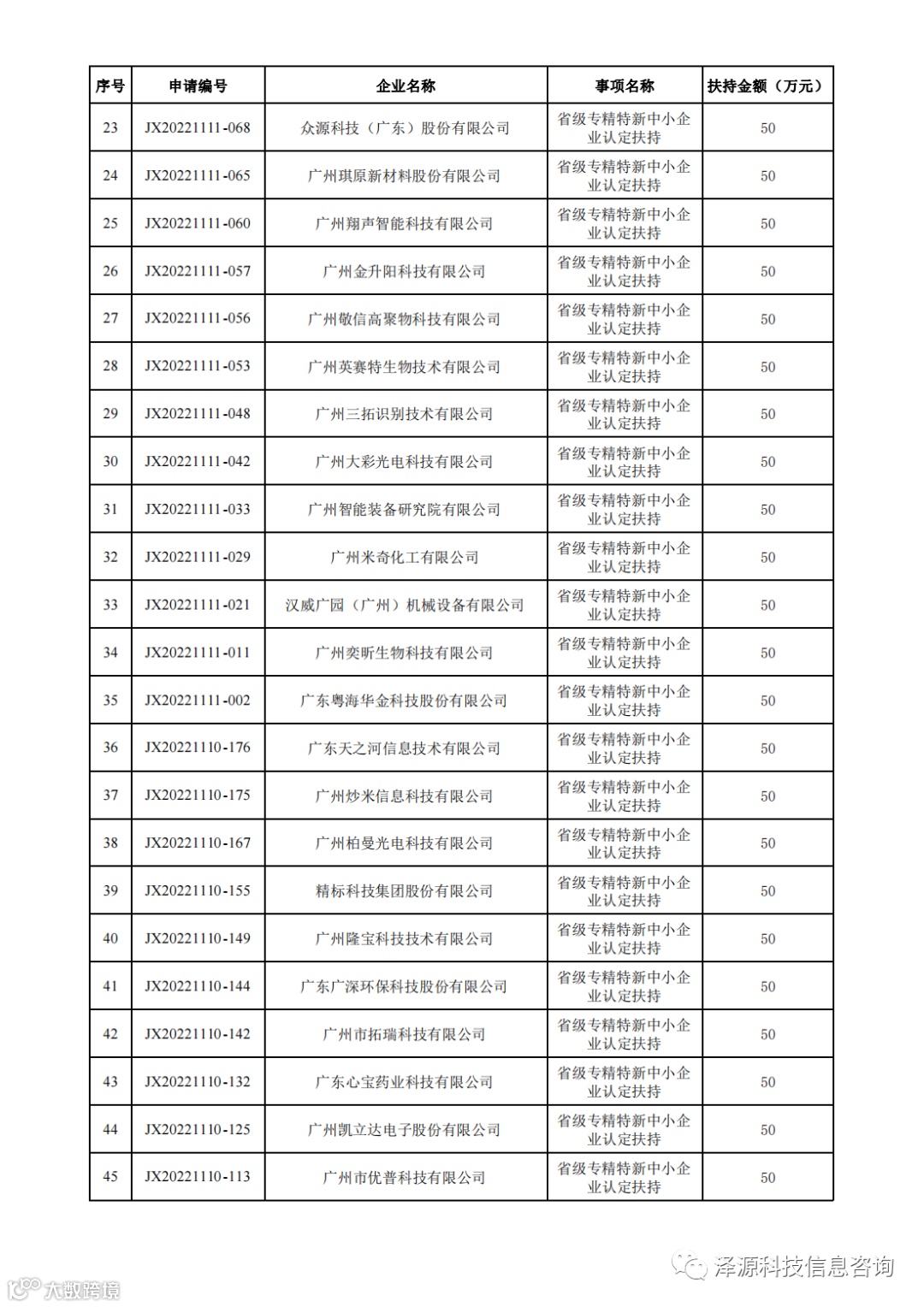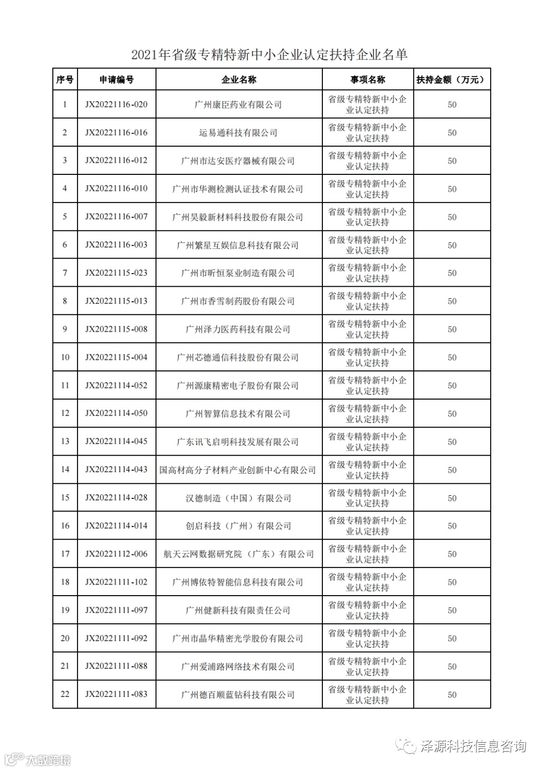 根据《广州市黄埔区工业和信息化局 广州开发区经济和信息化局关于印发广州市黄埔区 广州开发区进一步支持专精特新企业高质量发展办法的通知》(穗埔工信规字〔2021〕5号)、《广州市黄埔区工业和信息化局 广州开发区经济和信息化局关于印发广州市黄埔区 广州开发区进一步支持专精特新企业高质量发展办法实施细则的通知》(穗埔工信规字〔2021〕7号)文件精神,现同意拨付2021年省级专精特新中小企业认定扶持资金人民币伍拾万元整(¥500,000.00元),一次性拨付,具体明细详见附件。请根据本通知于2月22日-2月24日登录广州开发区政策兑现服务信息系统(http://zcdx.gdd.gov.cn)完成网上请款申请,办理资金拨付手续: