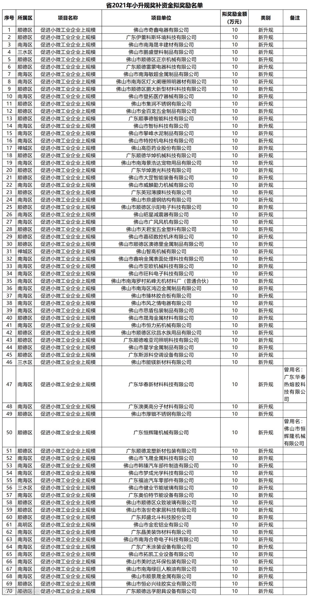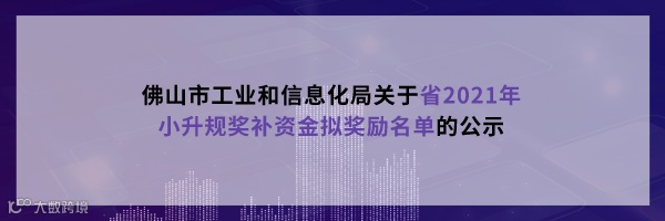 根据《广东省工业和信息化厅关于做好2021年促进小微工业企业上规模发展资金项目入库评审的通知》(粤工信融资函〔2021〕22号)、《广东省工业和信息化厅关于下达2021年小升规奖补资金安排计划的通知》(粤工信融资函〔2021〕41号)要求,现将省2021年小升规奖补资金拟奖励名单予以公示,公示期为2021年12月22日至12月28日(共7个自然日)。