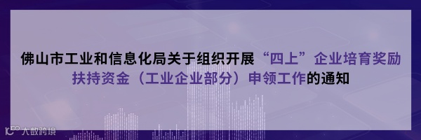 根据《佛山市人民政府办公室关于印发佛山市“四上”企业培育奖励扶持措施的通知》(佛府办〔2017〕25 号)和《佛山市人民政府办公室关于加快推进政府补助(扶持)资金直达企业个人改革有关事项的通知》要求,现通过佛山扶持通平台组织开展“四上”企业培育奖励扶持资金(工业企业部分)的申领工作。有关事项通知如下: