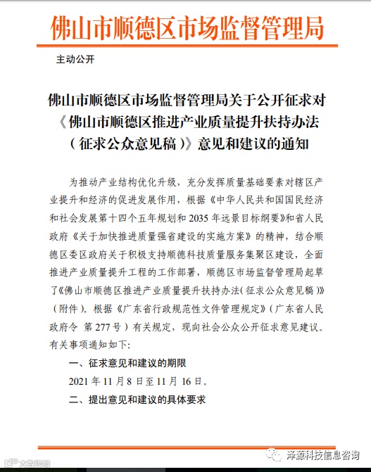 征求!《佛山市顺德区推进产业质量提升扶持办法(征求公众意见稿)》意见和建议