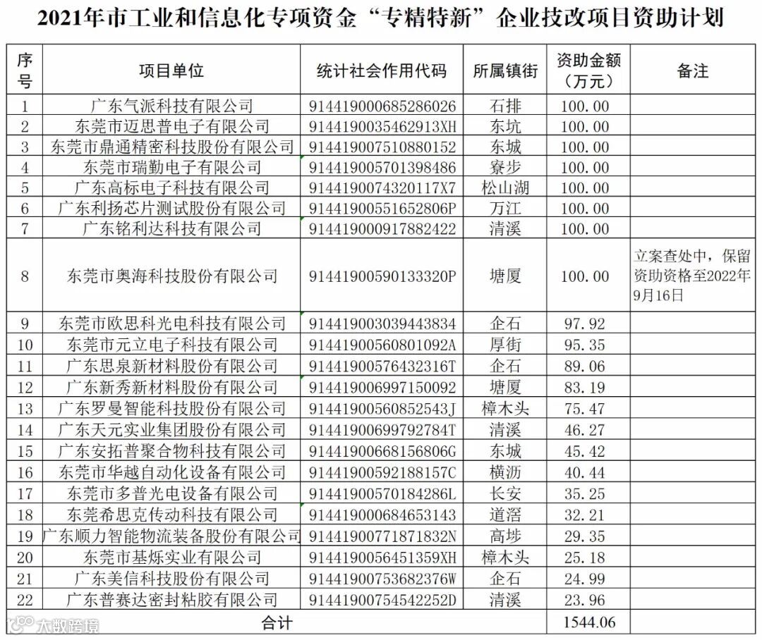 经东莞市政府批复同意,“专精特新”企业认定奖励项目合计1550万元资助东莞市毅新庆江机械制造有限公司等31家专精特新“小巨人”企业;“专精特新”企业技改项目合计1544.06万元资助广东气派科技有限公司等22家“专精特新”企业。