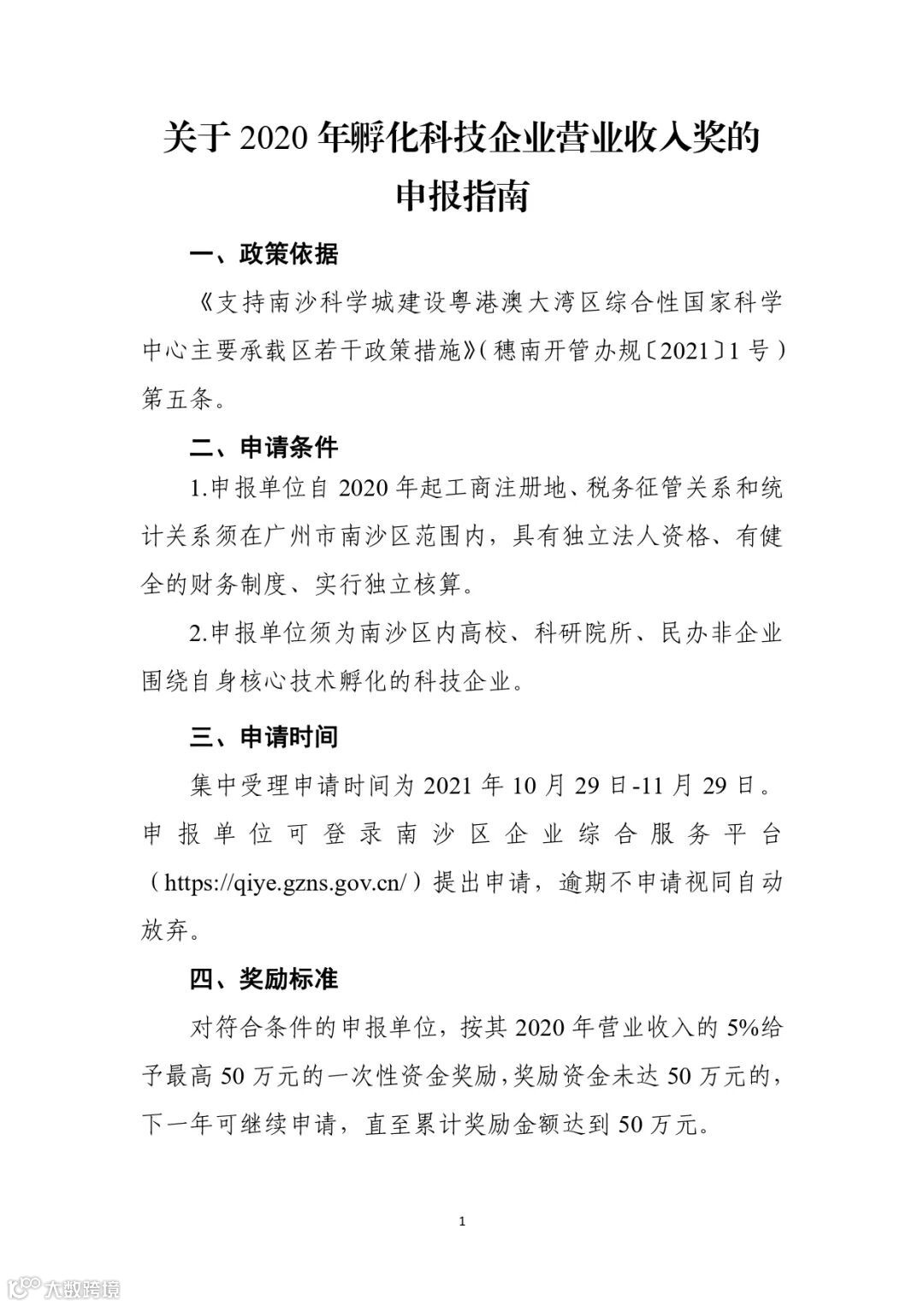 1. 关于2020年孵化科技企业营业收入奖的申报指南