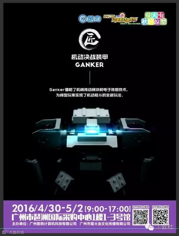 国内首款高速竞技机器人——【机动决战装甲Ganker】,将在五一假期广州萤火虫动漫游戏嘉年华,首次与大家见面了!格斗机器人Ganker国内首发会、首届格斗机器人擂台赛和丰厚的奖品在等着你们。