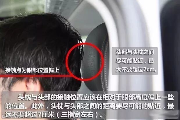 首先,头枕与头部的接触位置应该在相对于眼部高度偏上一些的位置。此外,头枕与头部之间的距离要尽可能的贴近,最远不要超过7厘米(三指宽左右),否则在碰撞时头枕会对头部产生严重的撞击,如果头枕前后距离无法调节,需要尽可能的通过座椅靠背角度来辅助调节。